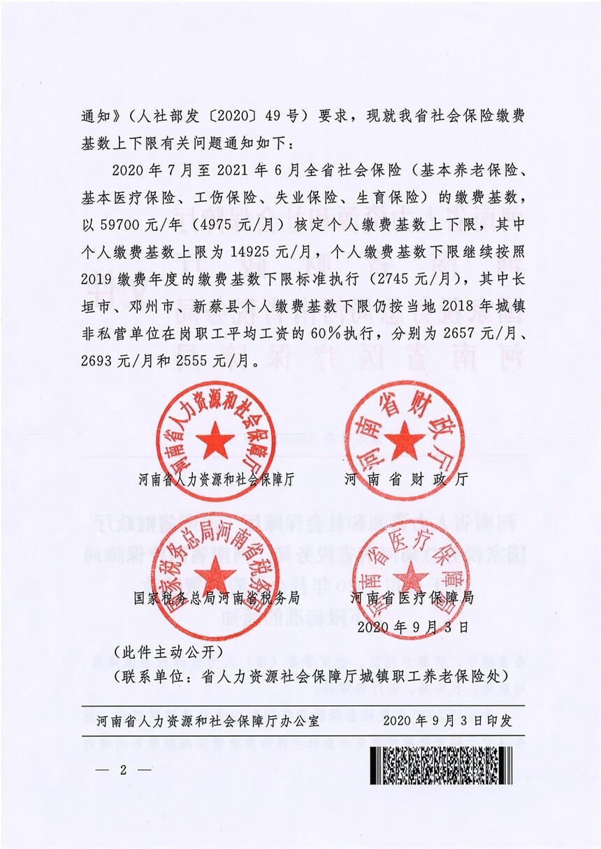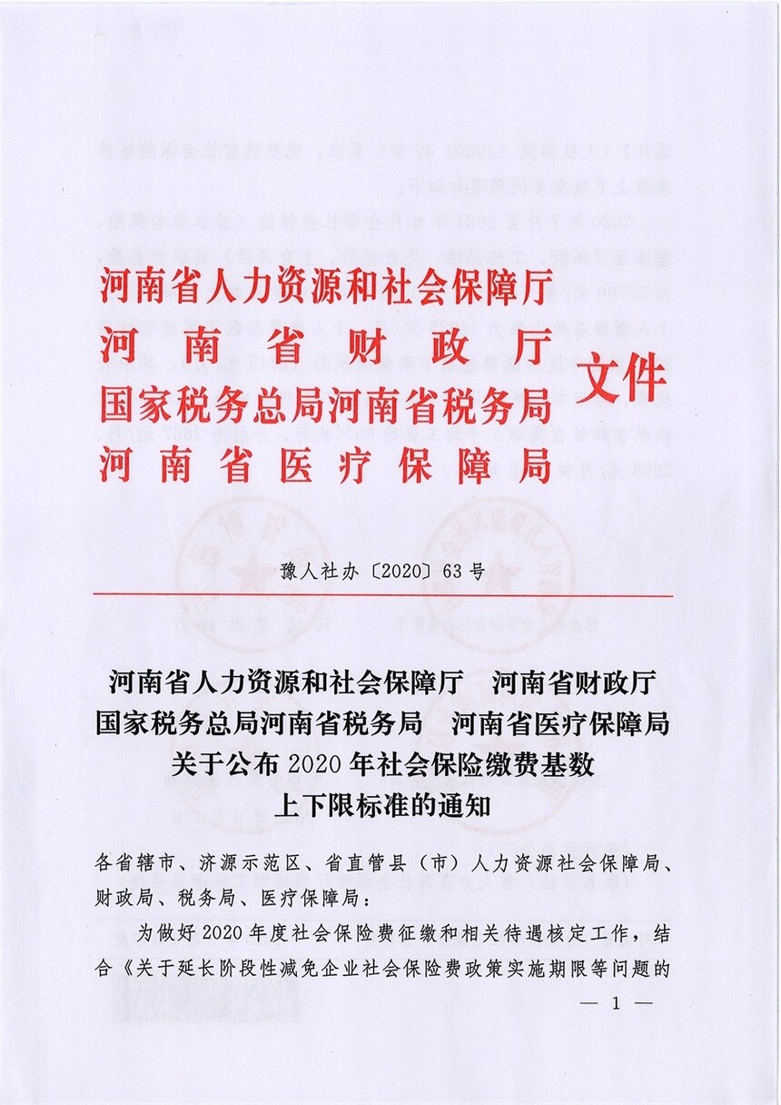 河南省人力资源和社会保障厅 河南省财政厅 国家税务总局河南省税务局关于公布2020年社会保险缴费基数上下限标准的通知